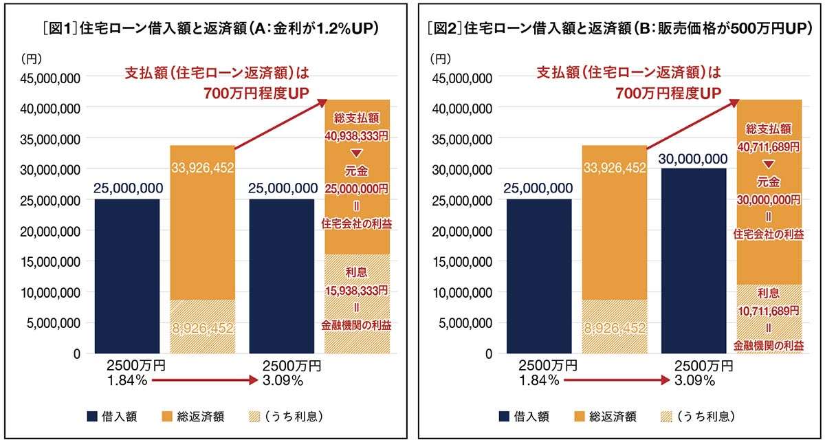 もちろん、エンドユーザーへ適正価格で住宅を提供できることが最も望ましいですが、「A:金利上昇による支払金額+700万円(図1)」と「B:販売価格アップによる+700万円(図2)」では、お客様にできる「価値」が異なります。