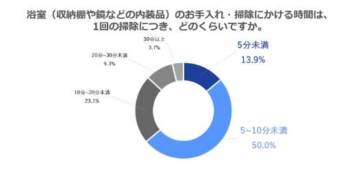 浴室のお手入れ・掃除の頻度については、浴槽まわりは「毎日」(32.1%)が最多となり、次いで「2~3日に1回程度」(23.2%)となった。収納棚や鏡などの内装品は「2~3日に1回程度」(23.2%)、「1週間に1回程度」(20.5%)で、こまめに掃除をしている人が多いようだ。また、収納棚や鏡などの内装品の掃除にかける時間は、「10分未満」が63.9%と、スピーディーに仕上げる人が多いことがわかった。