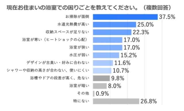 LIXIL(東京都品川区)は、システムバスルーム「リデア・リノビオV」の発売に伴い、浴室に関する調査を実施した。共働きで持ち家に住んでいる112人から「浴室での困りごと」を聞いたところ、「掃除が面倒」が最も多く(37.5%)、「水道光熱費が高い」(25.0%)、「収納スペースが足りない」(22.3%)と続いた。