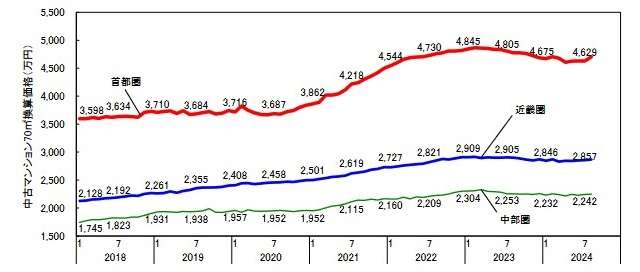 東京カンテイ(東京都品川区)は9月24日、8月の三大都市圏と主要都市における中古マンション70㎡あたりの価格を発表した。首都圏は、前月比1.6%増の4705万円と3カ月ぶりに上昇した。東京都は6729万円(2.4%増)と4カ月連続で上昇。東京23区の価格上昇が影響し、前年同月比の上昇率も5%台まで拡大した。神奈川県は3646万円(0.9%増)と3カ月連続プラスとなり上昇傾向が続く。埼玉県は2916万円(1.2%増)、千葉県は2679万円(0.3%増)といずれも反転上昇し、首都圏全域がプラスを示した。一方、東京都を除いて前年同月比は依然マイナスが続く。