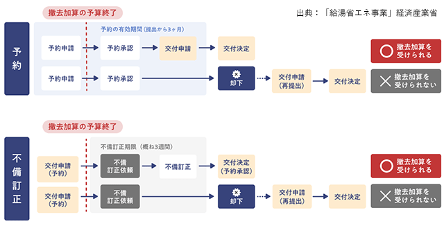 さらに、すでに撤去加算を含む交付申請の予約をした事業者に対し、予約の有効期間内に交付申請を行うことを要望。有効期間内に交付申請の提出が行われない場合、予約は却下される。提出した申請内容や書類に不備・不足があった場合は、事務局が再提出期限を設定して訂正を求めるが、指定された不備訂正期限までに再提出されない場合は申請が却下されるため注意が必要となる。