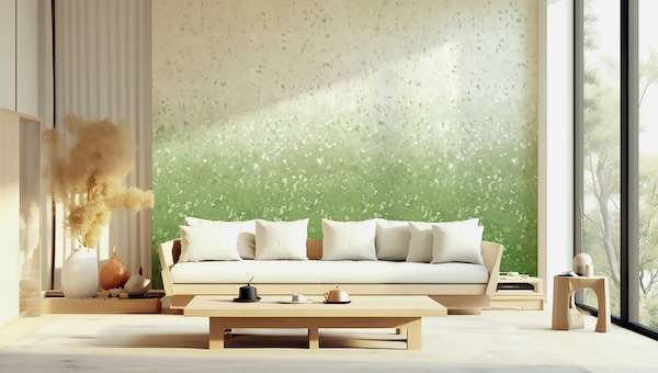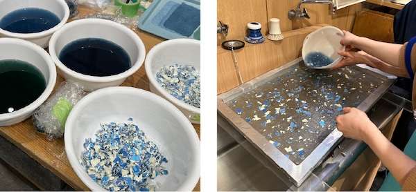 今回は、その廃棄サンプルをデザインに利用できないかという発想から、和紙漉き工房をもつ老舗和紙専門店・小津和紙に協力を仰ぎ、制作のサポートやデザインのノウハウを教えてもらいながら、和紙の材料である楮(こうぞ)をベースに、壁紙のサンプルを細かく粉砕したチップを混ぜ込み偶発的なデザインを表現した。