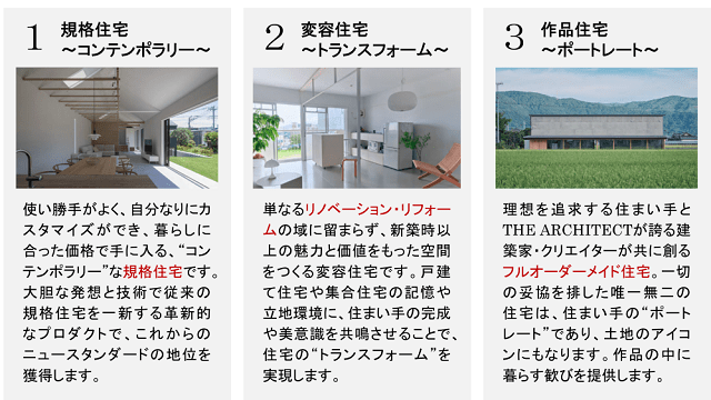 同プロジェクト第1弾「THE ARCHITECT」は、多様なライフスタイルや、建築原価の高騰・金利上昇などの社会課題に対応するため、3つのプロダクトを用意。カスタマイズ可能で暮らしに見合った価格の「規格住宅~コンテンポラリー~」、新築時以上の魅力と価値ある空間を実現する「変容住宅~トランスフォーム~(リフォーム/リノベーション)」、建築家・クリエイターと創るフルオーダーメイドの「作品住宅~ポートレート~(注文住宅)」を提供する。