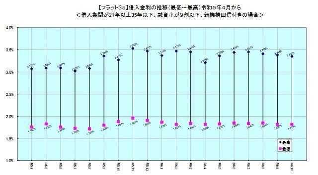 返済期間21年以上35年以下の最低金利は、融資率9割以下が1.82%、9割超が1.93%と、いずれも前月並み。最高金利は、9割以下が3.35%、9割超が3.46%で、前月から0.03ポイント下降した。