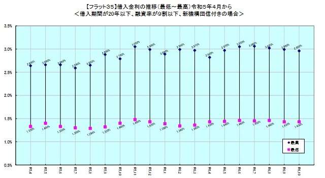 返済期間20年以下の「フラット20」の最低金利は、融資率9割以下が1.43%、9割超が1.54%で、いずれも前月並み。最高金利は、9割以下が2.96%、9割超が3.07%と、いずれも0.03ポイント下降した。