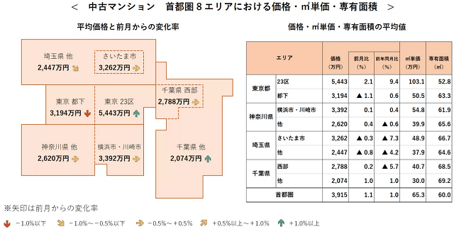 エリア別では、東京23区が前月比2.1%増と2カ月ぶりに上昇し、全体の価格を押し上げた。一方、埼玉県他は前月比が8カ月連続で下落するなど、エリアによって価格動向に違いがみられた。