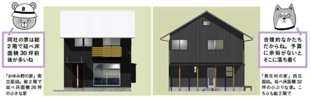 | 平屋は基礎の面積が2倍になり高額に。住宅街では採光の点で不利。上下階にスペースが分かれるのはプライバシー面など利点もある |