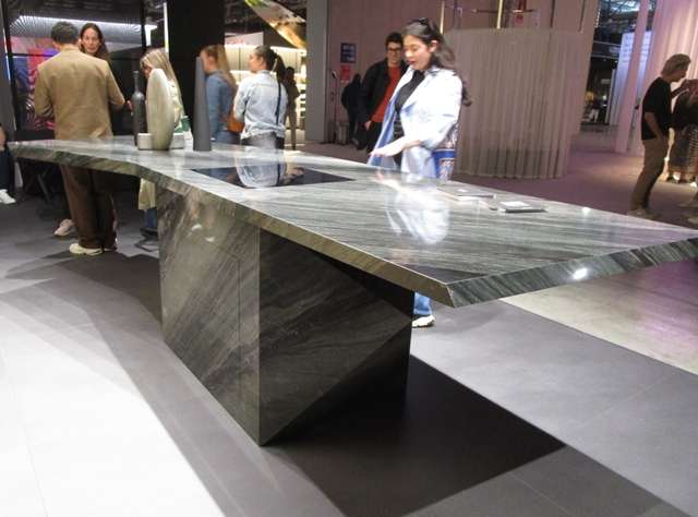 Daniel Libeskindデザイン《ORIGINA》。今年のキッチンの中でもひときわ目を惹いたアルミニウムの3Dドアは100%リサイクル可能。トップとバックウオールのトラバーチンは今年の人気柄の一つ
