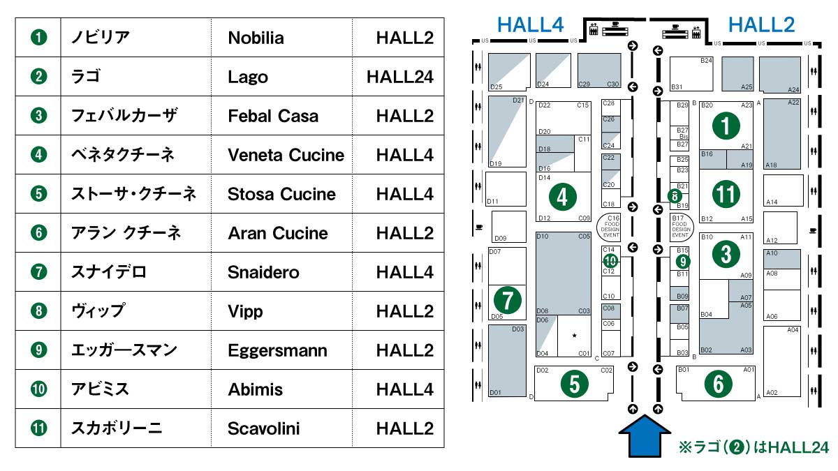 ①Nobilia -ノビリア- / ②Lago -ラゴ- / ③Febal Casa -フェバル・カーサ- / ④Veneta Cucine -ヴェネタ・クチーネ- / ⑤Stosa Cucine -ストーサ・クチーネ- / ⑥Aran Cucine -アラン クチーネ- / ⑦Snaidero -スナイデロ- / ⑧Vipp -ヴィップ- / ⑨Eggersmann -エッガースマン- / ⑩Abimis -アビミス- / ⑪Scavolini -スカボリーニ-
