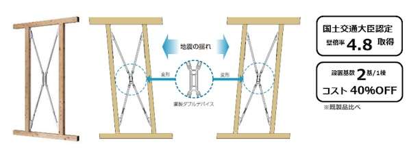 国土交通大臣認定の壁倍率4.8で、地震の揺れを吸収するスケーリング・フレーム(制振装置)。小さな揺れでは耐震、大きな揺れでは制振として機能する。