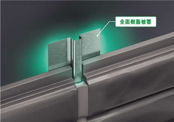 製品本体の亜鉛めっき鋼板全面に樹脂コーティングをほどこすことで、高いボンドブレイク性能を発揮。施工時にシーリングがジョイナーの天面以外に回り込んでしまった場合でも三面接着が起こらず、シーリングの打ち替え時にもシーリング材がきれいに剥がれるため補修作業の効率化につながる。