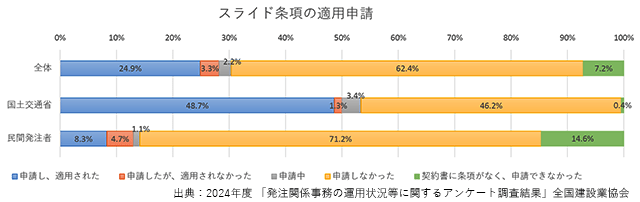 価格変動などに対応するための「スライド条項」の申請に関する調査では、直近1年間にスライド条項を申請したかを尋ねたところ、「申請しなかった」が62.4%と6割強に。民間発注では「申請しなかった」(71.2%)、「契約書になく申請できなかった」(14.6%)との回答が他の発注者に比べて高かった。「申請したが、適用されなかった」割合も、民間発注が4.7%で最も多かった。「申請し、適用された」割合は、全体では24.9%、国交省発注でも48.7%にとどまり、民間発注では8.3%と低い水準となっている。