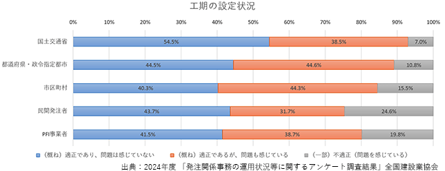 適正でない内容について、民間発注者では「作業員の休日(週休2日など)が考慮されていない」(61.4%)との回答が最多となった。次いで「降雨・降雪などの作業不能日が考慮されていない」(38.6%)、「猛暑日が考慮されていない」(35.4%)との回答が多くなっている。国などを含めた発注者全体では、「設計内容と現場条件が乖離(かいり)している」「支障物が未撤去、関係者との協議が整っていない」などが多かった。
