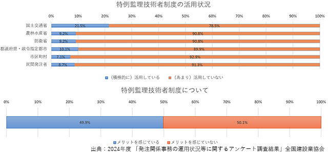 全国建設業協会(今井雅則会長、全建)が9月27日に公表した2024年度「発注関係事務の運用状況等に関するアンケート」結果によると、監理技術者を補佐する者を置くことで監理技術者が複数の工事を兼任できる「特例監理技術者制度」(2020年10月1日施行)を積極的に活用している企業は、国土交通省発注では2割強(21.5%)とやや多かったが、民間発注では8.7%にとどまっていることがわかった。同制度にメリットを感じている企業も49.9%と半数にとどまっている。(※調査結果Ⅱ「会員企業からの回答」の数値、以下同様)