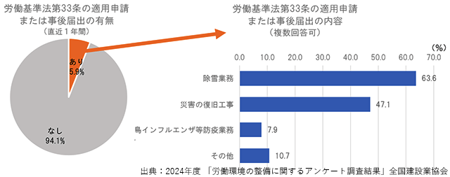 非常災害対応による労働時間延長について定めた「労働基準法第33条」に基づく申請状況については、過去1年に適用申請または事後申請を行った企業は全体の5.9%だった。最も多かったのは「除雪業務」で63.6%、次いで「災害の復旧工事」が47.1%で多かった。この申請手続きを行うことで時間外・休日労働の上限規制や「36協定」の内容にかかわらず、時間外・休日労働をすることが可能となっている。