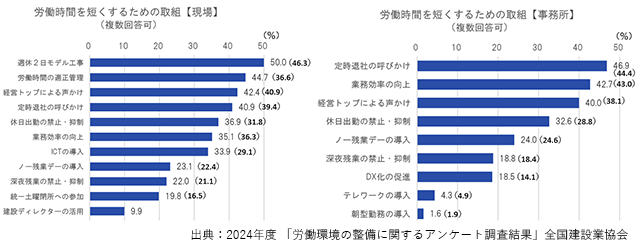 労働時間を短くするための工夫として、現場では「週休2日モデル工事」(50%)、「労働時間の適正管理」(44.7%)、「経営トップによる声かけ」(42.4%)に取り組む企業が多く、いずれも前年度より割合が増えている。事務所では「定時退社の呼びかけ」(46.9%)、「業務効率の向上」(42.7%)、「経営トップによる声かけ」(40.0%)と答えた企業が多かった。「呼び掛け」や「声かけ」だけでは、残業の要因となっている「書類が多い」「人員が足りない」などを解決できないことから、より効果的な対策を実施する必要がある。