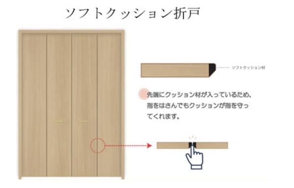 「ソフトクッション折戸」は戸先にクッション材を入れた折戸で、指を挟んでもクッションが指を守る。