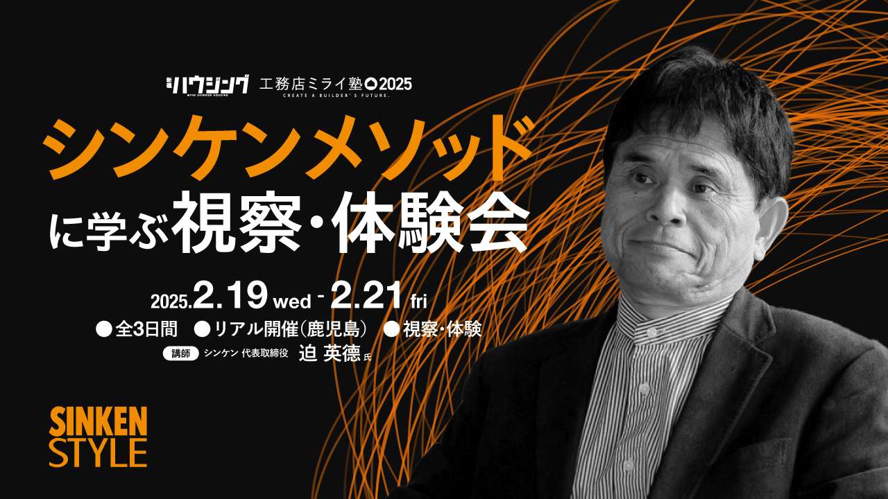 | 開催日時 | 【1日目】2025年2月19日(水) 15時00分~ ホテルチェックイン 13時00分~18時00分 与次郎ヶ浜モデルハウスの自由見学 ※17時00分までにご入場ください 19時00分~22時00分 親睦会 工務店とシンケン迫社長、スタッフとの設計力と経営力向上をめざす親睦会。自己紹介、視察・体験会の参加目的や、今回のセミナーに期待すること等を語っていただきます。 【2日目】2月20日(木) 8時00分~18時25分 住まいづくりをスタディ① ◎ミケラン体験 図面と体感によって思考を深める実践的な設計力、経営力を身につけるワークショップ。STUDY HOUSEや引渡し物件を視察・体験し、ミケランを行います。 ※ミケランとは…引き渡し前に行う、社内研鑽の場。設計者や大工などつくり手有志が集い、家づくりの可能性を引き上げるための意見を交わし合う。 (「ミケラン」は、シンケン独自の造語) ◎迫社長講演 「日本の住宅業『ここから何を研くか?』…を考える」 設計力に研きをかけ経営の安定を図るにはどうしたらいいか?迫メソッドを語ります。 ~21時00分 懇親会 設計や経営に関しての気づきや自社の課題を参加者同士が語り合う場。2日目で学んだことなど、シンケン迫社長やスタッフと大いに語らい合いましょう。 【3日目】2月21日(金) 7時00分~16時00分 住まいづくりをスタディ② ◎ミケラン参加 引渡し物件を視察・体験し、ミケランに参加。ミケランで学んだシンケン設計メソッドのポイントを押さえて、住まいの設計について議論をする場になります。 ◎今後の住まいづくりについて報告&質疑 省エネやDX、アフターメンテなどのテーマを通じて、シンケンスタッフと今後の住まいづくりについて考える場になります。 ◎新建新聞社・三浦の学びのまとめ ※内容が一部変更となる可能性があります。ご了承をお願いいたします。 |