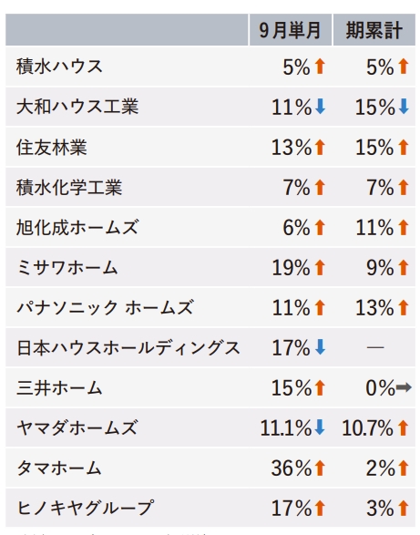 ハウスメーカー各社が10月17日までに発表した9月の戸建て注文住宅の受注速報値(対前年同月比、旭化成ホームズは集合も含む)は、12社中9社が増加。増加した9社のうち4社は好調で、2ケタ増が続いた。
