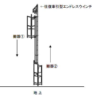 新製品は、足場資材を載せる搬器が2基あり、1回の稼働でそれぞれの搬器が上下に昇降、1基が足場の最上部で荷降ろしをしている間に、もう1基に地上で積み込みを行うことができるため、作業員の手待ち時間(荷台の往復にかかる待ち時間)が従来の半分で済み、作業効率が大幅に向上した。