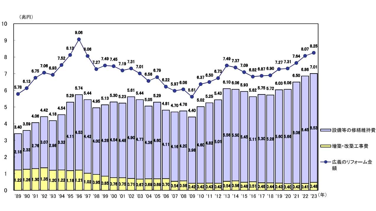 また、住宅着工統計上「新設住宅」に計上される増築・改築工事と、エアコンや家具等のリフォームに関連する耐久消費財、インテリア商品等の購入費を含めた「広義のリフォーム市場規模」は、前年比2.2%増の8兆2500億円で、7年連続で増加。8兆円を2年連続で上回り、1996年の9兆600億円に次ぐ水準となった。