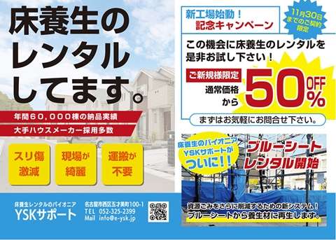 YSKサポート(名古屋市)は、環境に配慮した養生資材の「レンタル養生」を全国の工務店に向けて提案する。レンタル養生は、環境に配慮した同社独自の養生資材の供給システムで、「必要なときに必要な分だけの低コストでしっかりとした養生材」の提供を実現。ストックする必要がないので、需要の増減に素早く対応できる。養生パネルはすべてリサイクル生産。納品実績は年間6万棟におよぶ。現在、新工場始動記念キャンペーンとして11月30日までの新規契約限定で、床養生のレンタルが通常価格の半額になる期間限定キャンペーンを実施している。