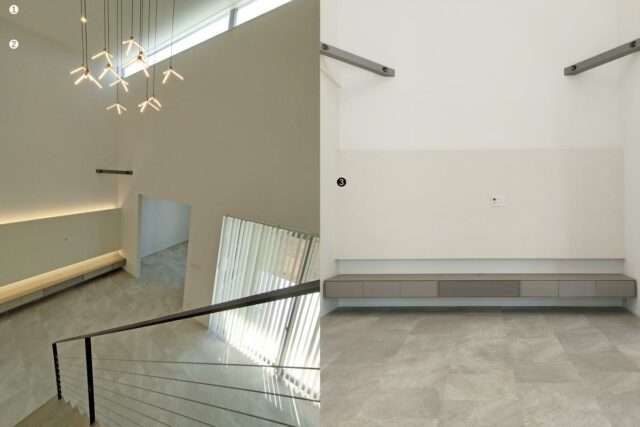 白からグレーへのグラデーションによってシンプルでモダンな空間を提供する