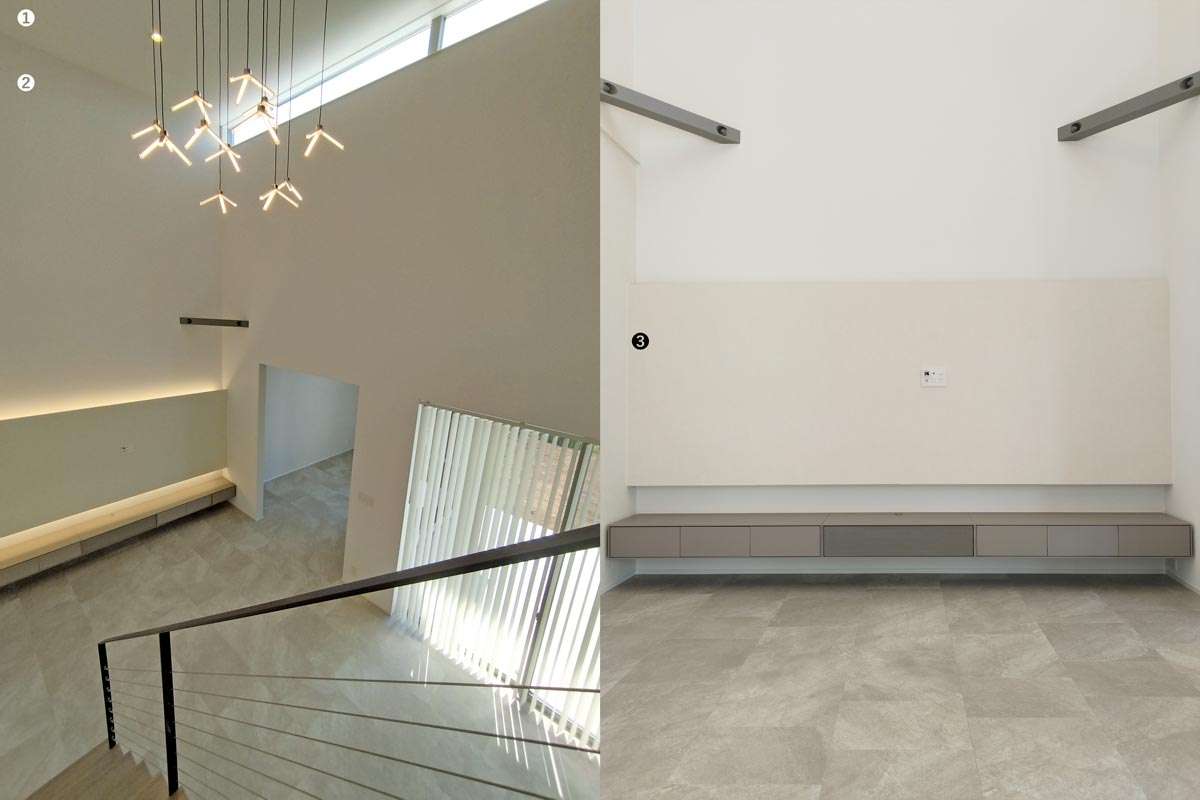 ❶❷壁、天井を漆喰のような質感の白いクロスですっきりとまとめたリビング。自然光やペンダント照明、間接照明など光の色みを反映して、多彩な表情を見せる空間となった