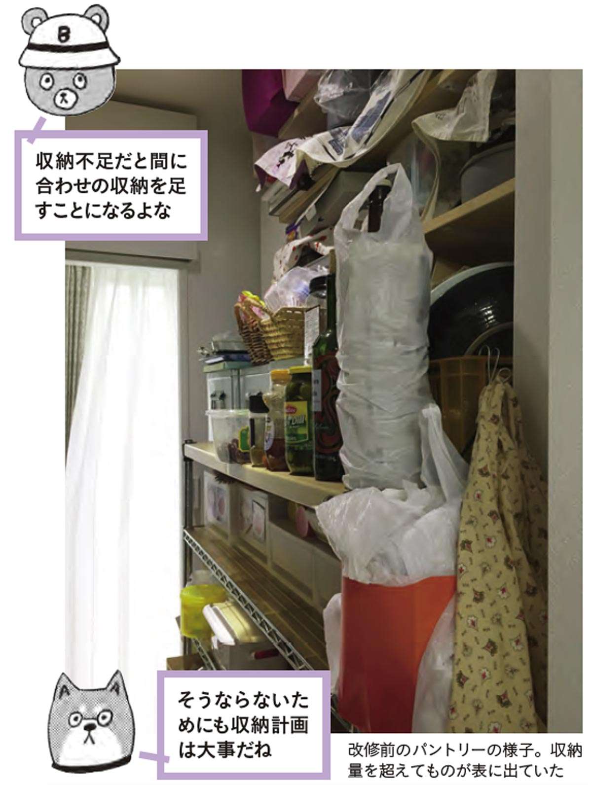 | 収納にものが収まらないと、よく使うものなどが常に表に出ていて雑然とした状態となる。作業性が落ちるほか、掃除もできなくなる |