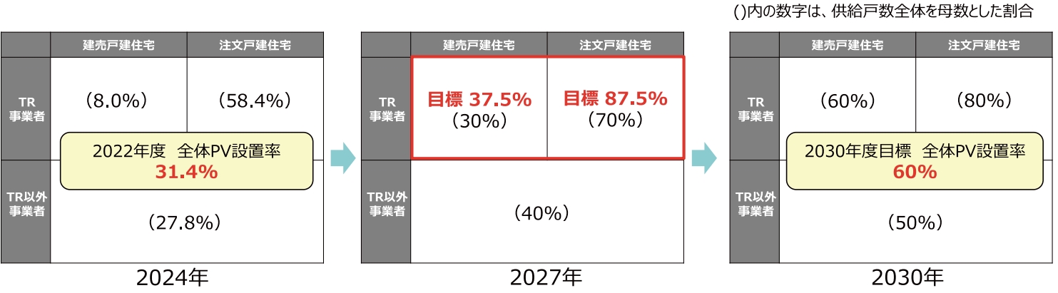 今回は、27年度に建売戸建て住宅全体では30%、注文戸建て住宅全体では70%に引き上げることを目指す。一方、地域性や敷地条件への配慮を求める声も挙がっているため、多雪地域や都市部狭小地などに位置する「太陽光発電の設置が合理的でない住宅」を供給戸数の20%とし、それらを除いた戸数を母数として目標値を設定する。