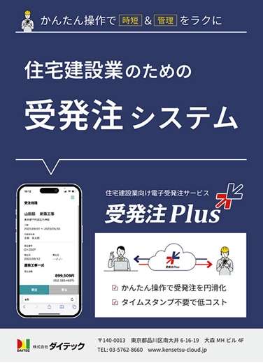 ダイテック(東京都品川区)は、電子受発注サービス「受発注Plus」を全国の工務店に向けて提案する。同サービスは、工務店や住宅会社の受発注業務を電子化する住宅建設業向けのクラウドサービスで、タイムスタンプ不要で、「改正電子帳簿保存法(電子取引)」に対応。誰でも簡単に利用できるシンプルなUIと直感的な操作性で、システムに不慣れな人も導入後すぐに運用を始めることができる。