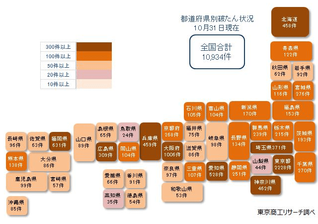 都道府県別では、東京都が2228件と全体の2割強(構成比20.3%)を占め、大阪府1006件、福岡県631件、愛知県528件、神奈川県462件、兵庫県459件、北海道458件、埼玉県371件、広島県309件と続く。300件以上が9都道府県、200件~300件未満が6府県、100件~200件未満が11県に広がっている。最少は鳥取県の24件だった。