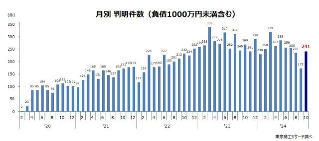 東京商工リサーチ(東京都千代田区)は11月1日、10月の「新型コロナ」関連の経営破たん(負債1000万円未満含む)が241件と2カ月ぶりに200件を上回ったと発表した。9月には26カ月ぶりに200件を下回ったが、10月は一転して大幅増となった。累計件数は、2020年2月の第1号発生以降、1万934件に達している。