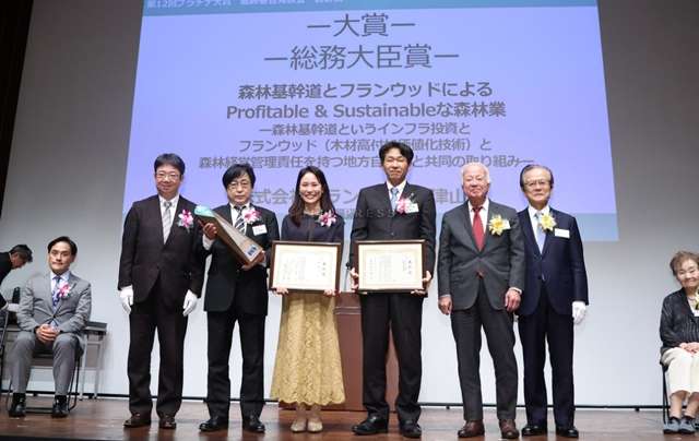 第12回プラチナ大賞で、大賞・総務大臣賞を受賞した「フランウッド、岡山県津山市」の関係者ら=6日午後、東京都中央区