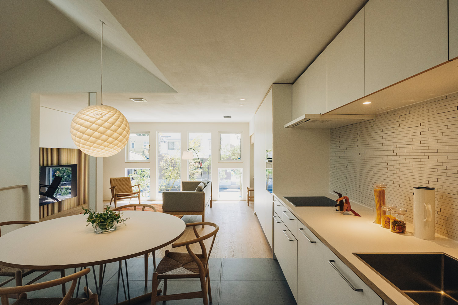 小松原モデルハウスは、アイトフースが設計を担当。蓄積してきた北欧デザインと自然素材に加え、掃除や洗濯、料理といった家事の時間が、日本は欧米の2~3倍であることに着目し、日常の家事負担を大幅に軽減する「家事1/2以下設計」を導入している。フィンランド式のロウリュサウナも併設する。躯体にはタナカホーム独自開発の工法・MeTAS(ミタス)を採用。市街地の狭小な、かつ準防火地域の敷地でもパッシブハウスレベルの性能を実現した。