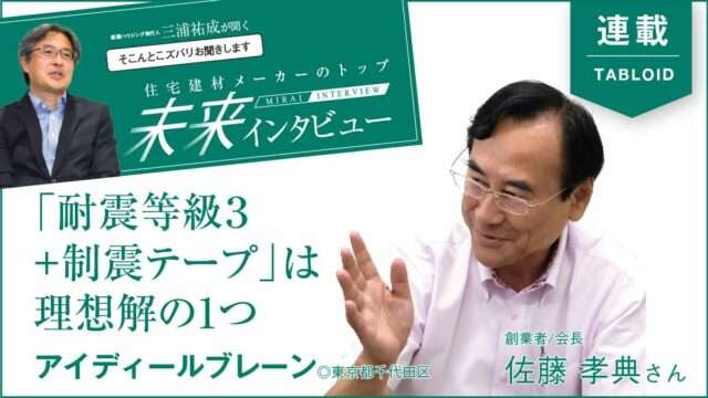 住宅業界の市況が厳しくなる中、地域工務店に設備を提供するメーカーの役割に注目が集まる。多種多様な建材設備の魅力は、工務店の価値にもなる。本連載では、建材・設備メーカーのトップに、新建ハウジング発行人・三浦祐成が「今こそ聞きたい未来の話」を深掘りする。第5回は、「制震テープ」や制震ダンパー「ミューダム」など、制震装置を開発するアイディールブレーン(東京都千代田区)会長の佐藤孝典さん。年始に起きた能登半島地震は地域に甚大な被害をもたらした。今後も南海トラフ地震や首都直下地震が予想されるなか、工務店は住まい手の安全を守るために、“地震に耐え続ける家”を問い直す時期にある。日本の家づくりのミライを守る開発者たちのトップの真意に迫った。