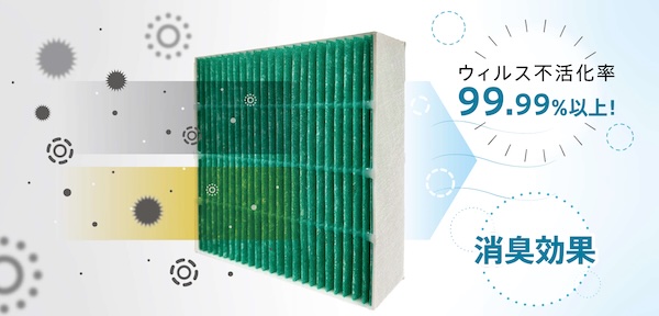 さらにコロナウイルスの不活化、カビ抑制、消臭効果も確認しているとする。ウイルス不活性化率99.99%以上。