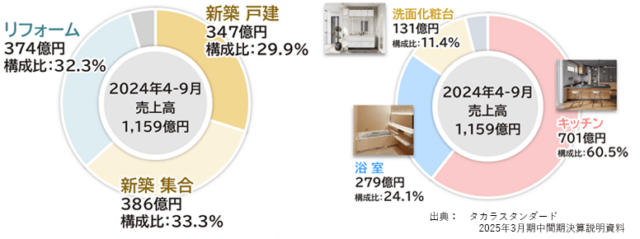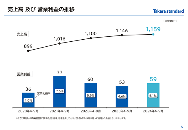 タカラスタンダード(大阪市)が11月6日発表した2025年3月期第2四半期(4~9月)決算は、新築集合住宅向けの販売が好調に推移したことから、売上高は前年同期比1.1%増の1159億5700万円となり、中間期での過去最高を更新。合理化・コストダウン、価格改定効果により、営業利益は同12.3%増の59億5700万円、経常利益は同11.6%増の61億3800万円。四半期純利益は投資有価証券の売却益を計上し、同12.3%減の38億8300万円となった。