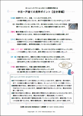 さくら事務所(東京都渋谷区、大西倫加代表)はこのほど、中古住宅の購入検討者向けに、物件見学の際のポイントがわかるチェックシートを作成し、同社のホームページで無料公開した。