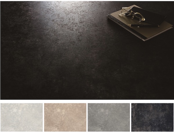 そこで、表面の耐久性を向上させ、天板で使用できる新仕様を開発。コンクリートや錆びた風合いの鉄鋼板などを再現した4柄をラインアップした。