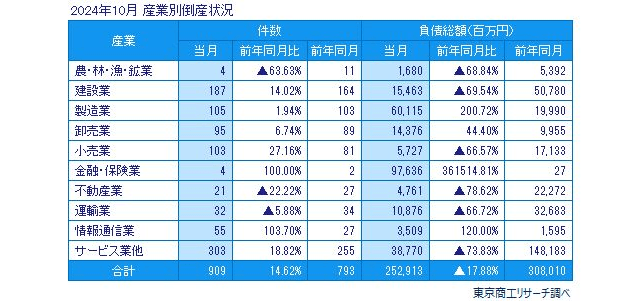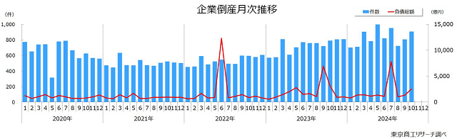 東京商工リサーチ(東京都千代田区)は11月11日、10月の企業倒産(負債額1000万円以上)が、前年同月比14.6%増の909件、負債総額は同17.8%減の2529億1300万円だったと発表した。