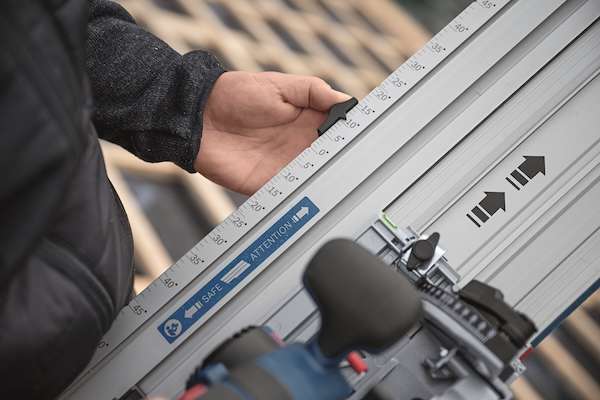 同時発売(別売)の「クロスカットガイドレール」を使用することにより、正確な直角、角度切断を容易に行えるコードレス丸のこ。