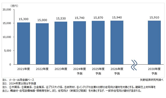 2024年度の市場規模は、前年度比1.4%増の1兆5740億円と予測。新設住宅着工戸数が伸び悩み、各建材の販売数量の縮小が見込まれるが、新規用途の開拓やリフォーム向け建材の需要、高付加価値品へのシフト、製品価格の改定効果により、金額ベースで市場は維持・拡大する見通し。