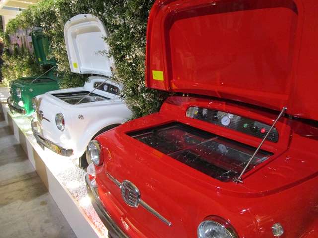 POPで遊び心満点のSMEGは1948年創業、カラフルなデザイン家電で若者に人気。今年もフィアットのボンネット内には冷蔵庫がビルトインされていました。
