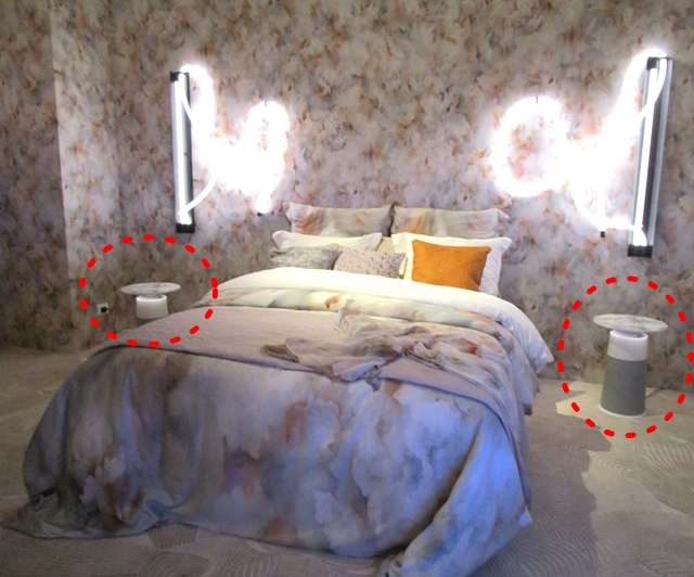 ソファやベッドサイドに置かれたサイドテーブルは実は空気清浄機、TOPは大理石(写真上・下)