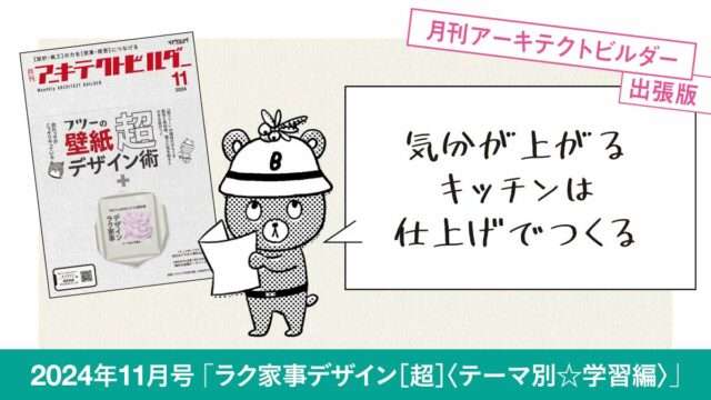 別冊「月刊アーキテクトビルダー」を、もっと多くの方に読んでいただきたい―そんな思いで9月から始まった本紙上での「出張版」。壁紙とラク家事デザイン、2本立ての11月号でしたが、出張版ではラク家事デザインのうち「キッチン」について、大菅力さん(取材・編集担当)&松本めぐみ(編集デスク)が語ります!