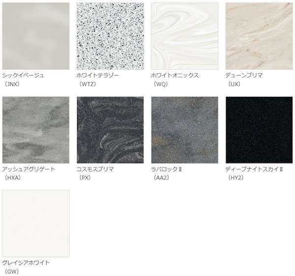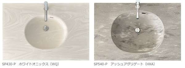 石目柄、流れ模様、コンクリート調などの上品かつシックな9色のカラーバリエーションを展開。同素材のカウンターと組み合わせて、ボウルとの接合部を美しく仕上げることができる。