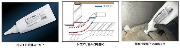 シロアリの侵入口となる基礎コンクリートの隙間、基礎配管部、セパレート金具、水抜き穴などに充填して、住宅の防蟻性能を長時間維持する。