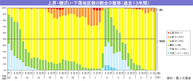 上昇の要因として、住宅地では利便性や住環境の優れた地区でマンション需要が堅調だったこと、商業地では再開発事業の進展や国内外からの観光客の増加により店舗・ホテル需要が堅調だったこと、オフィス需要が底堅く推移していることが挙げられている。