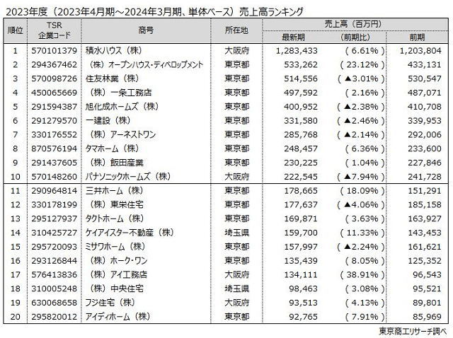 売上高別では、1兆円以上が1社、1000億円以上が17社(構成比14.7%)となった。トップは積水ハウスの1兆2834億円(前期比6.6%増)、2位はオープンハウス・ディベロップメントの5332億円(23.1%増)、3位は住友林業の5145億円(3.0%減)だった。オープンハウス系列が高い営業力で急成長している。また、上位20位のうち、6社(一建設、アーネストワン、飯田産業、東栄住宅、タクトホーム、アイディホーム)が飯田グループホールディングスの連結子会社で、売上高の合計は約1兆3000億円にのぼる。